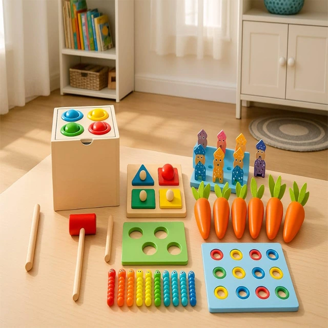 •  5-in-1 Montessori Activity Toy Set for Toddlers – This wooden educational toy set includes carrot pulling, shape sorting, magnetic fishing, color matching, and a hammer game. A complete early learning activity box for kids aged 2 to 4 years.